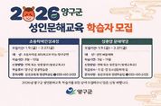 한방통신사 양호선기자 기자 | 양구군이 배움의 기회를 놓친 성인 학습자들의 기초학력 향상과 평생학습 참여 확대를 위해 ‘2026년 성인문해교육 운영 사업’을 오는 3월 9일 개강한다. 이번 교육은 18세 이상 초등학력 미취득자와 한글 기초교육이 필요한 성인을 대상으로 ‘초등학력 인정과정’과 ‘정중앙문해학당’을 중심으로 운영된다. 초등학력 인정과정은 3월부터 12월까지 평생학습관에서 초등 2·3단계 과정으로 운영되며, 지난해 과정 수료자도 연계 참여할 수 있다. 특히 올해 신설된 초등학력 인정 3단계를 수료하면 내년에 초등학력을 인정받아 졸업장을 받을 수 있어 학습자들의 배움에 대한 동기 부여와 성취감 향상에 도움이 될 것으로 기대된다. 정중앙문해학당은 3월부터 11월까지 운영되며, 지적장애인자립지원센터를 비롯해 국토정중앙면, 동면, 방산면 등 총 4개소에서 지역 맞춤형 문해교육을 실시한다. 또한 성인문해교육 과정에서는 연중 다양한 문화 체험 프로그램도 함께 운영된다. 상·하반기 ‘문화체험 학습의 날’을 통해 작은영화관, 박수근미술관, 백자박물관, 해안야생화공원 등을 방문하는 현장 체험학습을 진행하며