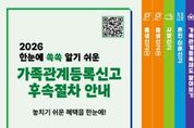 한방통신사 양호선기자 기자 | 속초시는 가족관계등록신고 이후 필요한 각종 후속 행정절차를 시민들이 보다 쉽고 편리하게 이해하고 이행할 수 있도록 가족관계등록신고 후속절차 안내 리플릿을 제작해 시청 종합민원실과 8개 동 주민센터에 배포한다. 이번 리플릿은 출생·혼인·사망 신고 이후 수반되는 다양한 행정절차를 한눈에 확인할 수 있도록 구성해 시민들이 관련 절차를 놓치지 않고 적기에 이행할 수 있도록 돕기 위해 마련됐다. 리플릿에는 출생 신고 후 첫만남이용권, 부모급여, 양육수당·아동수당, 출산장려금, 출산 축하 물품 지원 등과 혼인·이혼 신고 후 전입신고, 한부모가정 지원 서비스, 사망 신고 후 상속과 금융 관련 절차 등 유형별 주요 후속 절차가 신청 방법과 문의처와 함께 체계적으로 담겼다. 또 QR코드를 함께 수록해 스마트폰으로도 관련 정보를 신속하고 편리하게 확인할 수 있도록 접근성과 활용도를 높였다. 속초시 관계자는 “이번 안내 리플릿이 가족관계등록신고 이후 필요한 절차에 대한 시민 이해를 높이고 민원 처리 과정의 불편을 줄이는 데 도움이 되길 기대한다”며 “앞으로도 시민 중심의 생활밀착형 행정서