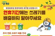 한방통신사 신유철기자 기자 | 파주시는 환경미화원 휴무 보장을 위해 추석 연휴 기간인 10월 4일부터 10월 6일, 10월 8일부터 10월 9일까지는 생활폐기물을 배출해서는 안 되며, 이 기간 동안에는 생활쓰레기 수거가 중단된다고 밝혔다. 단, 운정신도시 내 자동집하시설이 설치된 지역은 추석 연휴에도 평소처럼 집하시설을 통해 종량제봉투를 정상적으로 배출할 수 있고, 연휴 마지막 날인 10월 9일 18시부터는 쓰레기 배출이 가능하다. 시는 추석 명절과 아시아태평양경제협력체(APEC) 정상회의를 계기로, 행정안전부 주관 ‘대한민국 새단장 캠페인’에 동참해 9월 22일부터 10월 1일까지 중점 청소 및 단속 기간으로 지정했다. 이 기간 동안 추석맞이 대청소를 통해 청소 취약지역을 정비하고, 쓰레기 무단투기 예방을 위한 집중 단속을 실시해 연휴 기간 동안 청결한 환경을 유지할 계획이다. 또한 시는 연휴 기간인 10월 3일부터 10월 9일까지 시민들의 불편을 최소화하기 위해 상황반을 운영하고, 청소대행업체에서는 15개 기동반을 배치해 쓰레기 관련 불편 사항과 민원을 신속하게 처리할 계획이다. 특히 야당역,