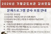 한방통신사 신유철기자 기자 | 가평군도서관은 2026년 도서관 문화프로그램을 운영할 강사를 공개 모집한다고 11일 밝혔다. 모집 대상은 가평군도서관 문화프로그램 운영을 희망하는 강사로 거주지 제한은 없으나 가평군 거주자 또는 인근 지역의 강사를 우선 모집한다. 모집 분야는 유아부터 성인을 대상으로 하는 독서문화 프로그램을 비롯해 취미, 교양, 체험 등 도서관에서 운영 가능한 분야이다. 모집 기간은 올해 12월부터 상시 모집하고 있으며 제출서류를 준비해 가평군 도서관 4개소(한석봉, 설악, 청평, 조종)에 방문 또는 가평군도서관 홈페이지 공지사항에 기재된 이메일로 제출하면 된다. 제출된 서류는 가평군도서관 강사인력풀에 등록 및 관리되며, 추후 도서관 문화 프로그램 운영을 위한 강사로 활동할 수 있다. 기타 자세한 내용은 가평군도서관 홈페이지 공지사항을 참고하거나 가평군도서관으로 문의하면 안내받을 수 있다. 도서관 관계자는 “이번 공개 모집을 통해 유능하고 열정 있는 강사를 모집해 지역 주민에게 다양하고 유익한 프로그램이 운영될 수 있도록 최선의 노력을 하겠다”고 밝혔다. [뉴스출처 :