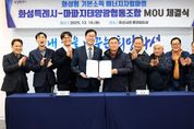 한방통신사 신유철기자 기자 | 화성특례시는 16일 시청 중앙회의실에서 마파지태양광협동조합과 ‘화성형 기본소득 에너지자립마을 조성을 위한 업무협약(MOU)’을 체결했다. 이날 협약식에는 정명근 화성특례시장을 비롯해 김진원 마파지태양광 협동조합장 등이 참석해, 주민주도형 재생에너지 기반 에너지자립마을 조성사업의 추진에 상호 협력하기로 했다. 이번 사업은 국유지를 활용해 주민이 사업비 전액을 부담해 100% 주민주도형 ‘에너지자립마을’을 조성하는 경기도 최초 사례로, 재생에너지 수익을 마을 복지와 기본소득으로 연계하는 ‘화성형 기본사회’ 정책의 첫 시범 모델이다. 마파지태양광협동조합은 석포6리 주민 25가구가 공동 운영하는 협동조합으로, 사업주체로서 장안면 석포리 823번지 제방 국유지에 415kW 규모의 태양광 발전설비를 설치한다. 사업비는 총 5억 2천만 원으로 전액을 주민이 자부담한다. 시는 협약에 따라 인허가, 관계기관 협의, 제도 검토 등 사업 추진에 필요한 행정적·제도적 지원을 담당하고, 에너지자립마을이 안정적으로 운영될 수 있도록 정책적 기반 마련에 협력한다. 또한 재생에너지 수