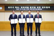 한방통신사 권영분기자 기자 | 충주시는 31일 시청 중회의실에서 2027년 하계세계대학경기대회의 성공적인 개최와 문화예술 발전을 위해 국립한국교통대학교, 건국대학교 글로컬캠퍼스, 충주시체육회와 공식 업무협약을 체결했다. 이번 협약은 지역 주요 체육관과 충주문화회관의 리모델링 공사로 경기장과 문화시설 활용이 일시적으로 제한됨에 따라, 지역 대학교 시설을 비롯한 각종 지원 협력을 공식화하기 위해 마련됐다. 협약식에는 조길형 충주시장, 윤승조 국립한국교통대학교 총장, 최영근 건국대학교 글로컬캠퍼스 부총장, 진용섭 충주시체육회장 등이 참석해 전문체육 및 생활체육 활성화, 문화예술 발전 등을 위한 협력 강화, 협약 기관 간 인적 인프라 지원 등 다양한 분야에서 협력하기로 뜻을 모았다. 협약을 통해 각 기관의 체육관 등 시설 대관 시 적극적인 협조를 받고, 주요 행사 진행 시 기관 간 자원봉사 등 인프라 지원이 이뤄질 것으로 기대된다. 조길형 시장은 “2027년 U대회 성공 개최와 문화예술 발전을 위해 모두가 한 데 힘을 모으는 좋은 계기가 마련됐다”라며, “이번 U대회는 대학생들과 지역사회 모두가 어우러져