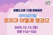 한방통신사 신유철기자 기자 | 구리시 갈매도서관은 국악뮤지컬 '토끼가 어떻게 생겼소' 무료 관람 사전 신청을 11월 25일부터 갈매도서관 홈페이지에서 선착순으로 신청받는다고 밝혔다. 국악뮤지컬 '토끼가 어떻게 생겼소'라는 연말을 맞아 오는 12월 13일 오전 11시, 갈매도서관 6층 대강당에서 경기아트센터와 함께 어린이와 가족을 위해 마련된 공연이다. 이번 공연은 지역 주민들의 연말 문화 향유 기회를 확대하고자 기획됐으며, 우리 전통 판소리‘수궁가’를 모티브로 새롭게 창작된 어린이 가족 국악뮤지컬이다. 익숙한 이야기와 흥겨운 음악이 어우러져 생동감 넘치는 무대가 펼쳐질 예정이다. 특히 작품 속에는 바다 생태계를 지키는 내용과 환경의 중요성을 담은 메시지가 포함되어 있어, 관람객들이 공연을 즐기면서 자연보호의 의미를 자연스럽게 배울 수 있는 시간이 될 것으로 기대된다. 백경현 구리시장은 “이번 공연이 아이들과 가족들이 함께 웃고 공감하며 환경의 소중함을 느낄 수 있는 시간이 될 것”이라며 “환경 특화도서관으로 자리 잡은 갈매도서관에서 앞으로도 환경을 생각하고 환경의 가치를 깨닫는 다양한 프로그램이 운