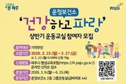 한방통신사 신유철기자 기자 | 파주시 운정보건소는 지역 주민의 건강 증진과 신체활동 실천을 돕기 위해 2026년 상반기 ‘순환 운동교실’과 ‘그룹 운동교실’참여자를 모집한다. 순환 운동교실 ‘혈관 튼튼·심뇌 튼튼’은 ‘에어보드’와 근력 강화(웨이트) 장비를 활용한 유산소·근력·스트레칭 복합 운동으로 구성된다. 건강반(65세 이상)은 월·수요일, 튼튼반(65세 미만)은 화·목요일에 주 2회 운영되며, 모집 기간은 2월 19일부터 25일까지이며, 3월 3일부터 6월 18일까지 운정보건소 2층 그룹운동실에서 진행된다. 그룹 운동교실 ‘건강하고파랑’은 어르신과 성인을 위한 다양한 프로그램을 운영한다. 어르신 대상 라인댄스와 훌라댄스, 성인 대상 건강요가, 줌바댄스, 근력운동 등 총 6개 반으로 구성되며, 모집 기간은 2월 23일부터 27일까지이고, 운영 기간은 3월 9일부터 6월 25일까지다. 신청은 파주시 평생교육포털을 통한 온라인 선착순 접수로 진행되며, 중복 수강은 불가하다. 정영숙 운정보건소장은 “이번 상반기 운동교실은 시민의 신체활동 기회를 확대하고, 규칙적인 운동을 통해 건강한 생활습관을 형성하
