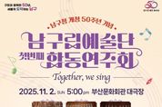 한방통신사 신유철기자 기자 | 부산 남구는 오는 11월 2일 오후 17시 부산문화회관 대극장에서‘남구립예술단 합동 연주회 Together, We Sing’을 개최한다. 남구립예술단은 ▲소년소녀합창단(지휘 김주곤) ▲오륙도여성합창단(지휘 곽기웅) ▲욜드합창단(지휘 고영호)으로 구성되어 있으며, 남구를 대표하는 문화사절단으로 활발히 활동하고 있다. 이번 연주회는 남구청 개청 50주년을 기념하여 세 합창단이 처음으로 함께하는 합동 연주회라는 점에서 특별한 의미를 지닌다, 각 합창단의 개성과 감성을 담은 다채로운 무대를 통해 관객에게 풍성한 음악적 경험을 선사할 것으로 기대된다. 소년소녀합창단은 맑고 순수한 목소리로 음악극‘푸른 하늘 은하수’를 선보이고, 오륙도여성합창단은 ‘그리움 그리고 사랑’이라는 테마로 세대를 이어주는 따뜻한 감성의 하모니를 들려주며, 욜드합창단은 인생의 깊이와 여운이 느껴지는 ‘행복한 인생’이라는 감동의 무대를 마련했다. 특히 이번 공연의 하이라이트는 세 합창단이 함께 꾸미는 합동무대다. 서로 다른 세대의 목소리가 한 무대에서 하나의 선율로 어우러지며, 노래를 통해 마음을 나누고
