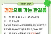 한방통신사 신다은기자 기자 | 광양시는 지역 주민의 건강생활 실천을 돕기 위해 11월 1일부터 30일까지 모바일 걷기 앱 '워크온'에서 ‘건강으로 가는 한걸음 11월 걷기 챌린지’를 운영한다고 밝혔다. 이번 걷기 챌린지는 1걸음당 1마일리지가 적립되며, 1일 최대 8천 마일리지가 누적된다. 기간 중 20만 보를 달성하면 20만 마일리지가 쌓여 모바일상품권(5천 원권) 응모가 가능하다. 시는 목표 걸음을 달성한 참여자 중 추첨을 통해 800명에게 상품권을 지급할 예정이다. 참여를 희망하는 시민은 모바일 걷기 앱 ‘워크온’을 설치하고 ‘광양시 공식 커뮤니티’에 가입한 뒤, 챌린지 탭에서 광양시 걷기 챌린지 참여하기를 누르고 목표 마일리지가 쌓일 때까지 스마트폰을 소지하고 걸으면 된다. 광양 지역 제한이 설정되어 있어 참여 시 휴대폰 위치 설정을 반드시 켜야 하며, 자세한 사항은 광양시보건소로 문의하면 된다. 반미순 건강증진과장은 “걷기는 체력 증진은 물론 스트레스 해소에도 큰 도움이 된다”며 “걷기 좋은 계절인 가을, 시민 여러분의 많은 참여를 바란다”고 말했다.