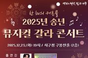 한방통신사 신태공 기자 | 대전 서구가 한 해를 마무리하고 새해를 맞는 무대를 선사한다. 서구는 오는 12월 23일 구청 2층 구봉산홀에서 ‘2025년 송년 뮤지컬 갈라 콘서트’를 개최한다고 10일 전했다. 공연은 90분간 진행되며 뮤지컬 배우 이건명과 라움앙상블이 출연한다. ‘맘마미아’ 메들리와 ‘영웅’ 등 대중적 인지도가 높은 작품을 비롯해, 캐롤 메들리 등 연말 분위기를 담은 무대가 선보인다. 이달 22일까지 서구청 홈페이지의 [구민참여] 게시판 [통합예약시스템]에서 예약받는다. 추가적인 사항은 서구 문화체육과로 문의하면 된다. 서구 관계자는 “올 한 해 구민 여러분이 서구에 보내주신 사랑과 관심에 감사드린다”며 “앞으로도 구민들의 문화 향유 기회 확대를 위해 지속적으로 노력하겠다 ”고 전했다. [뉴스출처 : 대전시 서구]