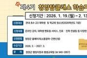 한방통신사 신태공 기자 | 청양군이 지역 학생들에게 수도권 수준의 고품격 교육 콘텐츠를 제공해 도농간 교육 격차를 줄이고 인재 유출을 막기 위한 ‘제4기 청양 탑클래스 학습지원’ 사업을 본격 추진한다. 군은 지난 19일부터 오는 2월 13일까지 군 홈페이지 간편신청 시스템을 통해 제4기 학습지원 참여 신청을 받는다고 밝혔다. 모집 대상은 2026학년도 기준 관내 초등학교 4학년부터 고등학교 3학년에 재학 중인 학생으로, 총 440명의 인재를 선발할 계획이다. 세부 모집 인원은 온라인 강의 지원 분야에 초등학생 125명, 중학생 75명, 고등학생 100명이며, 심화 학습을 돕는 1:1 온라인 멘토링 분야에는 중학생 60명, 고등학생 80명을 배정했다. 선정 방식은 선착순 및 선발 심사를 병행해 공정하게 이뤄진다. 지방소멸대응기금을 투입해 추진하는 ‘청양 탑클래스’는 도농 간 교육 환경 차이를 극복하기 위한 청양군의 핵심 교육 사업이다. 선정된 학생들은 오는 3월부터 ▲과목별 온라인 동영상 강의 ▲명문대생과의 1:1 온라인 멘토링(중·고생) ▲오프라인 진로·진학 컨설팅 및 입시