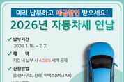 한방통신사 신다은기자 기자 | 장흥군은 15일 2026년도 자동차세 연납 고지서를 장흥군에 등록된 모든 차량 소유자에게 일괄 발송했다고 밝혔다. 자동차세 연납 제도는 매년 6월과 12월 두 차례로 나눠 부과되는 정기분 자동차세를 1월에 미리 납부하면 공제 혜택을 주는 제도다. 올해도 1월 중 납부 시 4.5%의 세액 공제가 적용되며, 최근 어려운 경제 상황 속에서 가계 부담 완화에 도움이 될 것으로 군은 기대하고 있다. 납부 기한은 2026년 1월 16일부터 2월 2일까지이며, 납부 기간 내에 연납 고지서를 기반으로 납부를 완료하면 별도 신청 없이도 자동으로 세액 공제가 반영된다. 납부는 금융기관 창구, 위택스 온라인·모바일 앱, 인터넷 지로, ARS 등 다양한 방법으로 가능하다. 연납 후 타 시·도 전출입이나 주소 변경이 있어도 추가 세금 부담이 없으며, 연납 후 차량 폐차 또는 양도 시 일할 계산에 따라 잔여 세액을 환급받을 수 있다. 장흥군 관계자는 “고지서를 받으신 군민들은 납부 기한 내에 꼭 연납을 완료해 세금 절감 혜택을 누리시기 바란다”고 말했다. [뉴스출처