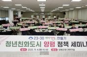 한방통신사 신유철기자 기자 | 양평군은 지난 4일 오후 3시 양평군청 대회의실에서 ‘청년친화도시 조성을 위한 미래 방향성과 차별화 전략’을 주제로 ‘23-30 매력 양평 만들기’ 정책세미나를 개최했다. 이번 세미나는 청년이 머물고 싶은 도시, 청년이 주도적으로 참여할 수 있는 ‘매력양평’ 구현을 위한 실질적인 정책 방향을 논의하고자 마련됐다. 이날 행사에는 전진선 양평군수를 비롯해 양평군의회, 양평군 정책자문단, 청년정책위원회, 청년단체 등 관계자 100여 명이 참석했다. 1부에서는 인사말씀과 축사, 기념촬영이 진행됐으며, 2부에서는 손신 교수(아신대학교, 양평군 정책자문단 위원)의 ‘청년친화도시 조성을 위한 미래 방향성 및 차별화 전략’과 길청순 이사장(지역농업네트워크 서울경기제주협동조합, 양평군 정책자문단 위원)의 ‘농업·농촌의 미래와 청년농업인’ 발제가 이어졌다. 전진선 양평군수는 “청년이 머물고 싶은 도시, 청년이 주도적으로 참여할 수 있는 ‘매력양평’을 만들기 위해 행정과 지역사회가 함께 힘을 모아야 한다”며 “오늘 세미나에서 제시된 다양한 의견을 향후 청년정책에 적극 반영하겠다”고 밝혔다.