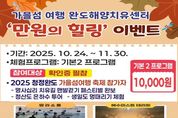 한방통신사 신다은기자 기자 | 완도해양치유센터에서 10월 24일부터 26일까지 개최되는 ‘2025 청정 완도 가을 섬 여행’과 연계하여 ‘만원의 힐링’ 이벤트를 진행한다. ‘만원의 힐링’ 이벤트는 ‘완도왔섬, 치유됐섬’을 주제로 개최되는 ‘2025 청정 완도 가을 섬 여행’을 하는 관광객이 가을 섬 여행과 함께 부담 없이 해양치유 프로그램을 즐길 수 있도록 마련됐다. 이벤트는 ‘청정 완도 가을 섬 여행’의 프로그램인 ▲제2회 명사십리 치유길 맨발 걷기 페스티벌 ▲청산도 은하수 투어 ▲생일도 멍때리기 중 1개 프로그램에 참가(확인증 지참)하면 완도해양치유센터 프로그램(기본 2)을 1만 원에 체험할 수 있다. 참가자들은 10월 24일부터 11월 30일까지 완도해양치유센터 대표 그램인 딸라소풀과 해수 미스트 테라피, 해조류 거품 테라피, 머드 테라피를 이용할 수 있다. 한편 ‘청정 완도 가을 섬 여행’ 기간 동안 완도 해변공원 일원에서 ‘완도 해양치유’ 홍보관을 운영하여 관광객이 완도 여행을 추억할 수 있도록 ‘해양치유 힐링 한 컷’ 즉석 사진 인화 서비스를 제공할 예정이다. 군 관계자는 “