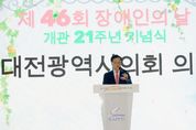 한방통신사 신태공 기자 | 대전시의회 조원휘 의장은 9일 제46회 장애인의 날 및 유성구장애인종합복지관 21주년 기념식에 참석해 장애에 대한 편견을 허물고 지역 공동체의 결속을 다지는 계기를 마련했다. 이날 행사에는 장애인 가족과 자원봉사자, 후원기관 관계자 등 800여 명이 참석했으며, 식전공연을 시작으로 유공자 시상, 경품추첨, 기념품 증정까지 다채로운 프로그램으로 꾸며졌다. 조원휘 의장은 축사를 통해 "표창을 받으신 분들의 미소에서 대전의 희망을 보았다"며 "대전시민 100명 중 5명, 유성구에만 만 이천여 명의 구민이 장애와 함께 살아가고 계신다"고 말했다. 이어 "장애는 약 88%가 후천적 원인인 만큼, 장애인 복지는 특정 누군가의 문제가 아닌 우리 모두의 내일을 준비하는 일"이라고 강조했다. 또한 "여러분이 행복해야 대전이 행복하다"며 "시의회는 누구도 소외되지 않는 '평등한 대전'을 위해 든든한 동행자가 되겠다"고 밝혔다. [뉴스출처 : 대전시 대전시의회]