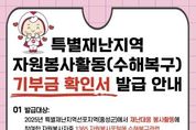 한방통신사 신태공 기자 | 홍성군자원봉사센터는 지난해 군에 기록적인 폭우가 내리며 특별재난지역으로 선포됨에 따라, 수해복구 현장에서 자원봉사활동에 참여한 자원봉사자를 대상으로 ‘특별재난지역 자원봉사용역 등에 대한 기부금 확인서’를 발급한다고 밝혔다. 이번 기부금 확인서는 특별재난지역 수해복구에 참여한 자원봉사자의 봉사활동을 사회적으로 인정하고, 연말정산 및 종합소득세 신고 시 소득공제 혜택을 받을 수 있도록 지원하기 위한 것이다. 발급 대상은 2025년 홍성군 수해복구 자원봉사활동에 참여하고, 1365자원봉사포털에 수해복구 관련 봉사시간이 입력된 자원봉사자이며, 신청은 내달 13일까지이다. 신청을 희망하는 자원봉사자는 홍성군자원봉사센터 공지사항을 참고하여 기부금 확인서 서식을 내려받아 파란색 표시된 항목을 작성한 후, 기관 이메일(cnvc14@v1365.or.kr)로 제출하면 되고, 방문 접수를 희망할 시 센터로 직접 방문하거나, 가까운 읍·면행정복지센터에 제출하면 된다. 발급된 기부금 확인서는 연말정산 시 소득공제 항목에 기재하여 증빙자료로 제출하거나, 종합소득세 신고 시 활용할 수 있다. 기부금