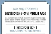 한방통신사 신유철기자 기자 | 가평군이 사회연대경제 조직 간 협업 활성화를 위해 ‘2026년 사회연대경제 협업활성화 컨설팅’을 추진하고, 참여 조직을 5월 4일까지 모집한다. 이번 컨설팅은 지역 문제 해결을 위한 협업 기반 사업모델을 발굴하고, 조직 간 네트워크를 구축해 실제 협업사업으로 이어지도록 하기 위한 것이다. 모집 대상은 관내 사회적기업, (사회적)협동조합, 마을기업 등 사회연대경제 조직으로 10개소 내외를 선정할 예정이다. 교육은 오는 5월 11일부터 15일 중 3일간 음악역1939 세미나실에서 진행된다. 프로그램은 사회연대경제와 협업에 대한 이해를 바탕으로 △협업 아이디어 발굴 △팀 프로젝트 운영 △사업모델 설계 및 발표 등 실무 중심 과정으로 구성된다. 특히 참여 조직 간 교류를 통해 공동사업으로 발전 가능한 협업 모델을 도출하는 데 중점을 뒀다. 군은 이번 컨설팅에서 발굴된 모델이 실제 사업으로 이어질 수 있도록 후속 지원사업도 병행한다. 별도 공모를 통해 선정된 관내 사회연대경제 조직에는 협업사업비를 지원할 계획이다. 참여를 희망하는 조직은 5월 4일 오후 6시까지 이메일 또는 가