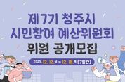한방통신사 권영분기자 기자 | 청주시는 시민참여예산제의 효율적인 운영과 활성화를 위해 오는 18일까지 제7기 청주시 시민참여예산위원 14명을 공개모집한다. 시민참여예산위원회는 예산에 대한 시민들의 의견을 수렴·집약하고 수립 과정에 참여해 예산안에 대한 의견을 제출하는 기능을 수행한다. 시민이 제안한 사업에 대한 우선순위 결정, 추진 결과 점검 등 과정 전반에 직접 참여하게 된다. 이번 공개모집 인원은 14명으로 읍·면 8명, 동 6명이다. 임기는 2026년 1월 1일부터 2027년 12월 31일까지 2년간이다. 신청 자격은 청주시에 주민등록이 되어 있거나 청주시에 영업소 본점 또는 지점을 둔 사업체의 대표자・임직원, 청주시 소재 기관·단체에 근무하는 사람 등이다. 세금 및 과태료 체납자는 신청할 수 없다. 신청은 시 누리집 고시공고에서 신청서를 내려받아 18일까지 시 예산과, 구청 행정지원과, 읍·면·동 행정복지센터에 방문하거나 이메일, 우편 등을 통해 제출하면 된다. 시는 연말까지 선정해 개별통지할 계획이다. 시 관계자는 “투명하고 효율적인 예산운