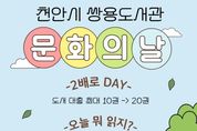 한방통신사 신태공 기자 | 천안시 쌍용도서관은 매달 마지막주 수요일 ‘2026 문화가 있는 날’ 행사를 운영한다고 16일 밝혔다. 쌍용도서관은 올해 문화가 있는 날에 1인당 20권의 책을 빌릴 수 있는 ‘2배로 Day’와 블라인드 도서 대출 행사 ‘오늘 뭐 읽지?’를 운영한다. 자세한 사항은 쌍용도서관으로 문의하면 된다. 쌍용도서관 관계자는 “문화가 있는 날 행사를 통해 시민들이 독서에 관심을 갖게 되는 계기가 되길 바란다”며 “도서관 이용의 활성화를 기대한다”고 말했다. [뉴스출처 : 충청남도 천안시]