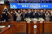 한방통신사 신유철기자 기자 | 경남 밀양시는 15일 시청 소회의실에서 밀양시 발전에 기여한 전·현직 부시장 3명에게 명예시민증을 수여했다. 밀양시 명예시민증은 우방국가 또는 다른 지방자치단체의 주민으로서 밀양시정에 공로가 현저하거나 밀양시를 방문하는 귀빈에게 수여하는 증서로, 밀양시 부시장을 역임한 27대, 28대, 29대 부시장에게 수여됐다. 수여 대상자는 △27대 밀양시 부시장 김성규(현 경상남도 교육청년국장) △28대 밀양시 부시장 허동식(현 부산진해경제자유구역청 개발본부장) △29대 밀양시 부시장 곽근석(현 밀양시 부시장)이다. 수여 대상자들은 재임 기간 동안 시정의 주요 현안을 해결하며 밀양시의 다양한 정책을 이끌어 지역의 경제적, 사회적 발전에 기여해 왔다. 특히, 나노융합국가산업단지 조성 및 기업유치 기반 강화, 창녕~밀양 간 고속도로 개통, 김해~밀양 고속도로 건설 추진 등 지역경제 활력을 위한 기반 마련에 공통적으로 힘써왔다. 아울러 스마트 선도 농업을 통한 활기찬 밀양 조성, 머물고 싶고 다시 찾는 밀양을 만들기 위한 다양한 정책을 추진하며 품격 있는 문화·관광 도시
