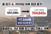 한방통신사 신태공 기자 | 천안시는 지난해 5월 총인구 70만 명을 돌파한 이후 증가세를 이어가며 2019년 이후 최대 인구 증가 기록을 경신했다고 15일 밝혔다. 지난해 12월 말 기준 천안시 총인구(외국인 포함)는 지난해 같은 기간보다 7,544명(1.1%) 늘어난 70만 4,843명으로 집계됐다. 이는 2019년 이후 연간 증가치 중 최대 증가한 수치로 분석된다. 천안시 총인구는 지난해 5월 70만 403명을 기록한 이후 7월(785명), 9월(1,088명), 10월(666명) 등 매월 꾸준한 증가세를 보였다. 특히 9월에는 한 달 사이 1,000명 이상이 늘어나며 증가세가 가장 두드러졌다. 인구 통계적 지표 개선도 눈에 띈다. 지난해 출생아 수(3,711명)가 사망자 수(3,591명)를 앞지르며 3년 만에 ‘인구 데드크로스’를 극복했다. 천안시는 출산 친화적 사회분위기 확산을 위해 ▲7남매 다둥이 맘인 김소정 씨 출산장려 홍보대사 위촉 ▲출산장려 릴레이 캠페인 전개 ▲초중고 및 읍면동 찾아가는 인구교육 확대 운영 등 시민 인식제고 활동도 함께 추진해 정책효과를 높였다. 시는 임
