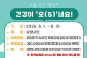 한방통신사 신다은기자 기자 | 광양시는 오는 5월 1일부터 5월 31일까지 모바일 걷기 앱 워크온을 활용한 ‘건강이 오(5)네요! 5월 걷기 챌린지’를 운영한다고 24일 밝혔다. 이번 챌린지는 하루 최대 8천 걸음까지 인정되며, 기간 내 누적 21만 보를 달성한 참여자는 광양사랑상품권 5천 원권 응모 자격이 주어진다. 시는 목표 걸음 수를 달성한 참여자 중 추첨을 통해 700명에게 상품권을 지급할 계획이다. 광양시민 누구나 참여할 수 있으며, 참여를 희망하는 시민은 모바일 걷기 앱 워크온을 설치한 뒤 ‘광양시 공식 커뮤니티’에 가입한 후 챌린지 메뉴에서 광양시 걷기 챌린지 ‘참여하기’를 선택해 스마트폰을 소지하고 걸으면 된다. 챌린지 참여 시에는 광양 지역 제한 설정으로 휴대전화 위치 기능을 활성화해야 하며, 자세한 사항은 광양시보건소로 문의하면 된다. 광양시 관계자는 “걷기는 일상에서 쉽게 실천할 수 있는 건강 습관”이라며 “이번 챌린지를 통해 시민들이 걷기의 즐거움을 느끼고 건강한 생활을 이어가길 바란다”고 말했다. 한편, 광양시는 시민 건강 증진과 생활 속 신체활동 활성화를 위해