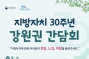 한방통신사 신유철기자 기자 | 행정안전부는 민선 지방자치 30주년을 맞이해 전국 5개 권역을 대상으로 권역별 간담회를 진행한다고 밝혔다. 이와 관련해 8월 25일 강원특별자치도 춘천시 강원디자인진흥원에서 첫 번째 간담회를 개최한다. 이날 간담회에 이어 9월에서 10월 중 경상권(경상북도 구미시), 수도권(인천광역시), 충청권(세종특별자치시), 전라권(광주광역시)에서도 시·도와 함께 권역별 지방자치 30주년 간담회를 개최할 계획이다. 이번 강원권 간담회에는 김민재 행정안전부 차관, 김광래 강원특별자치도 경제부지사가 참석해 주민, 지방의원, 지방공무원 등 약 40명을 대상으로 지방자치에 대한 경험과 느낌, 앞으로의 바람 등을 청취할 예정이다. 행사는 주민 참여 활성화, 행정서비스 만족도, 강원특별자치도 자치권, 지방의회의 역할 등 주제별 전문가 설명과 지방자치 퀴즈, 질의응답 이후에 모든 참석자가 자유롭게 의견을 발표하는 순서로 진행된다. 또한, ‘지방자치에 바란다’, ‘지방자치는 ㅇㅇㅇ이다’ 등 엽서 제작과 영상 편지 남기기와 같은 다양한 이벤트도 열린다. 행정안전부와 강원특