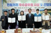 한방통신사 김성의 기자 | 고창군이 지난 17일 2025년 하반기 민원·국민신문고 응대 우수공무원을 선정해 시상식과 간담회를 열었다. 민원처리 우수공무원은 각 분야별로 5명씩을 선정하여 표창을 수여했다. 먼저, 국민신문고 분야는 민원처리 건수, 담당자의 민원요지 파악, 성실한 답변 등을 평가했다. 서민지 주무관(도시디자인과), 김민경 주무관(환경위생과), 고민성 주무관(사회복지과), 박재규 주무관(종합민원과), 유혜령 주무관(문화예술과)이 선발됐다. ‘민원처리 마일리지 분야’는 처리기간이 2일 이상인 법정 민원에 대해서 단축 일수를 마일리지로 적립해 누적 점수가 높은 공무원을 선정했다. 남혜원 주무관(사회복지과), 이민해 주무관(환경위생과), 송서경 주무관(신활력경제정책관), 전필규 주무관(사회복지과), 배재영 주무관(해양수산과)이 선정됐다. 고창군수는 시상식 이후 민원 처리 우수공무원들의 애로사항과 건의 사항을 청취했다. 고창군수는 “국민신문고 민원 처리와 민원 실적은 단순한 처리 건수를 넘어 국민의 불편 해소와 ‘신뢰받는 행정 구현’에 중요한 지표다”며, “
