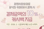 한방통신사 신유철기자 기자 | 광명시가 5월 가정의 달을 맞아 가족 외식은 즐겁게, 골목상권은 활기차게 만드는 특별한 캐시백 혜택을 제공한다. 시는 오는 5월 1일부터 5월 한 달간 음식점·카페에서 광명사랑화폐로 결제하는 경우 결제 금액의 10%를 환급하는 ‘가족 외식비 캐시백 지원사업’을 추진한다고 28일 밝혔다. 이번 사업은 고물가 상황에서 외식 수요가 집중되는 가정의 달을 맞아 시민들의 가계 부담을 실질적으로 덜어주는 한편, 소비 침체로 어려움을 겪는 지역 소상공인을 돕기 위해 마련했다. 캐시백 혜택은 광명사랑화폐 가맹점 중 음식점과 카페에서 결제할 때 적용된다. 특히 지역화폐 사용처를 오는 8월 31일까지 고유가 피해지원금 기준에 맞춰 연매출 30억 원 이하 업체까지 한시적으로 확대하면서, 가족 외식비 캐시백 혜택을 받을 수 있는 가맹점 범위도 함께 넓어졌다. 결제액(인센티브, 정책수당 결제분 제외)의 10%를 1인당 최대 1만 원까지 광명사랑화폐로 즉시 환급받을 수 있으며, 준비된 예산이 소진하는 경우 조기 종료한다. 지급된 캐시백은 지급일로부터 1개월 이내 사용해