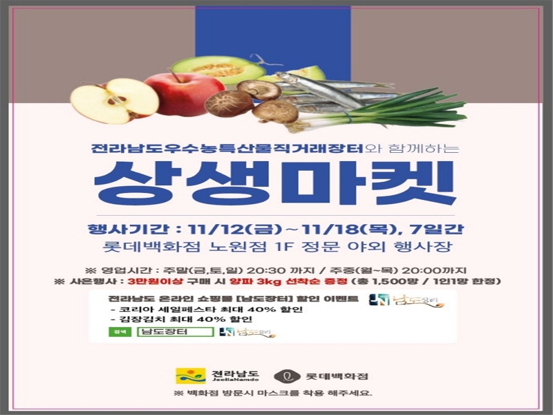 강하춘 전남도 농식품유통과장은 “코로나19 장기화에 따른 급식 중단, 판로 확보 등 어려움을 겪은 전남 농가의 우수 농수특산물을 한 자리에 모았다”며 “도시민의 따뜻한 소비가 지역 농어민과 소상공인의 경제에 활력으로 이어지길 기대한다”고 말했다.