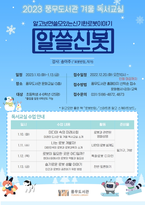 김포시 풍무도서관(관장 소영만)은 내년 1월 10일(화)부터 13일(금)까지 4일간 겨울방학을 맞이하여 독서교실「알.쓸.신.봇(알고보면 쓸모있는 신기한 로봇이야기)」를 운영한다.