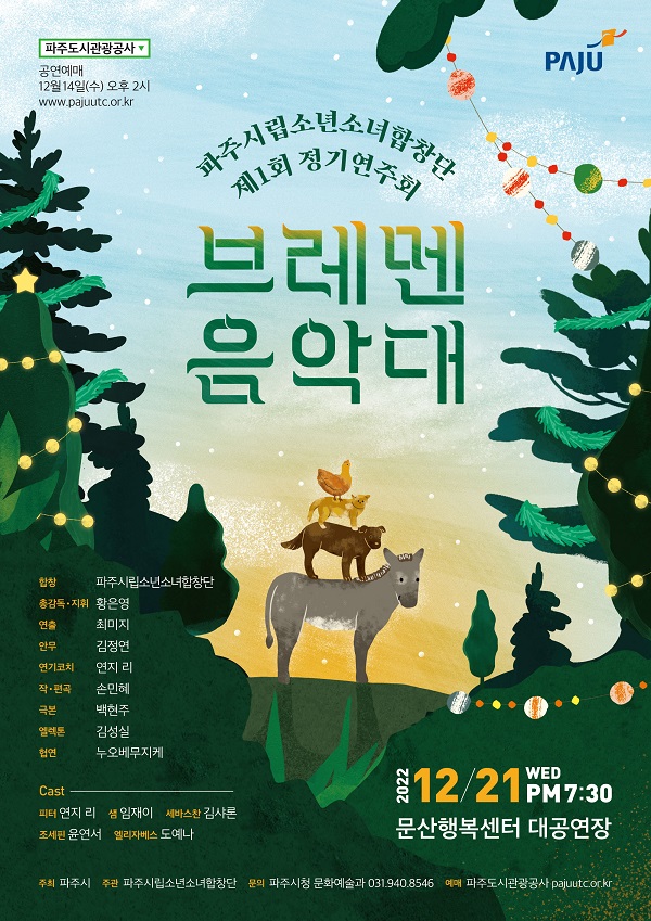 파주시(시장 김경일)는 오는 21일 문산행복센터 대공연장에서 파주시립소년소녀합창단 제1회 정기연주회 ‘브레멘 음악대’ 공연을 선보인다. 이번 공연은 파주시립소년소녀합창단의 첫 정기연주회로 오페라에 비해 작은 규모의 연기와 노래, 합창 등이 섞인 어린이 오페레타이다.