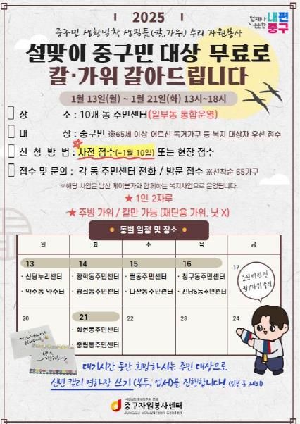 중구민이라면 누구나 무료로 이용할 수 있으며, 복지대상자 등 취약계층에게 우선적으로 지원한다. 칼과 주방 가위를 포함해 1인당 최대 두 자루까지 서비스를 받을 수 있다.