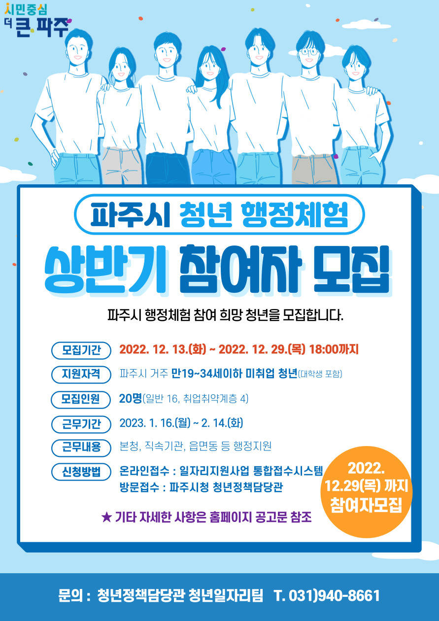 파주시(시장 김경일)는 오는 29일까지 2023년 상반기 청년 행정체험 참여자 20명을 모집한다.파주시 청년 행정체험은 2023년 신규 추진 사업으로, 공공기관 현장 실무 경험과 진로 탐색의 기회를 제공하기 위해 마련됐다.