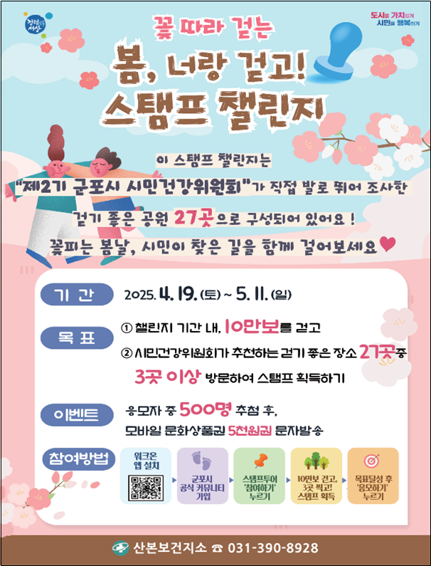 이번 챌린지는 제2기 군포시 시민건강위원회가 직접 선정한 걷기 좋은 공원 27곳을 배경으로, 시민들이 봄꽃 가득한 계절에 일상 속에서 가볍게 걸으며 건강도 챙기고 지역 자원을 재발견할 수 있도록 기획됐다.