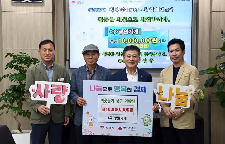정성주 김제시장은 “(유)광원기계의 꾸준한 나눔이 지역사회에 큰 귀감이 되고 있다.”며, “기탁된 성금은 꼭 필요한 곳에 전달해 더 많은분들이 안정되고 행복한 삶을 누릴 수 있도록 하겠다.“고 말했다.