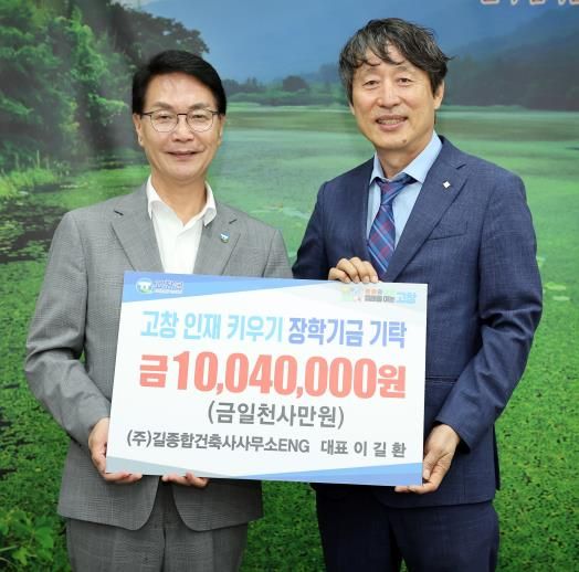 한방통신사 김성의 기자 | ㈜길종합건축사사무소ENG가 지난 25일 오후 고창군장학재단에 1004만원의 장학금을 기탁하며 고창군 학생들의 학업과 성장을 응원했다.