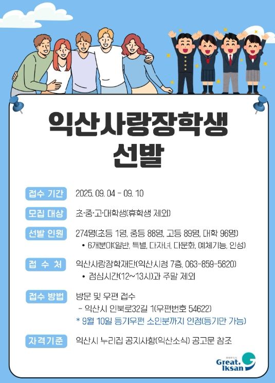 익산시는 (재)익산사랑장학재단이 오는 9월 4일부터 10일까지 2025년도 '익산사랑 장학생'을 모집한다고 26일 밝혔다.