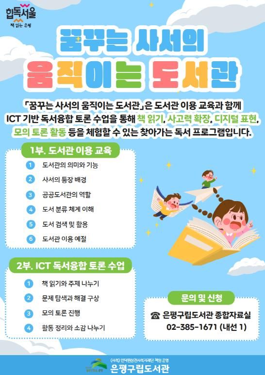 이번 프로그램은 서울시 정책사업인 ‘힙독서울, 책 읽는 은평’ 캠페인의 일환으로 마련됐으며, 도서관이 직접 관내 초등학교와 지역 아동기관을 찾아가 진행하는 참여형 수업이다. 정보통신기술(ICT)를 활용한 독서 융합 토론 수업을 중심으로 운영되며 첫 수업은 우리동네키움센터 은평 8호점에서 시작한다.