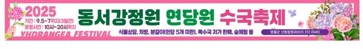 2021년 강원특별자치도 1호 지방 정원으로 등록하고 운영 중인 영월 동서강정원 연당원은 30만 본의 수목 및 초화류가 식재되어 계절별 다양한 볼거리를 제공하고 있으며, 그중 3,000본이 식재된 수국을 활용하여 금 년 수국 축제를 개최한다.