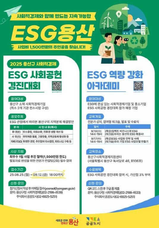 한방통신사 신유철기자 기자 | 서울 용산구가 내달 12일까지 ‘2025 용산구 ESG 사회공헌 경진대회’에 참가할 지역 내 사회적경제기업을 모집한다.
