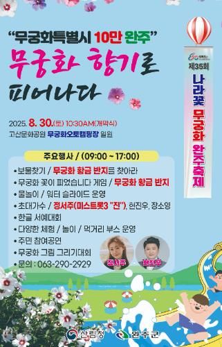 유희태 완주군수는 “광복 80주년을 맞아 개최되는 이번 축제가 나라꽃 무궁화의 상징성을 되새기고, 더 많은 국민들에게 사랑받는 계기가 되길 바란다”며 “완주군이 대한민국 대표 무궁화 도시로서 위상을 높이고, 무궁화특별시로서 새로운 도약을 준비하겠다”고 밝혔다.