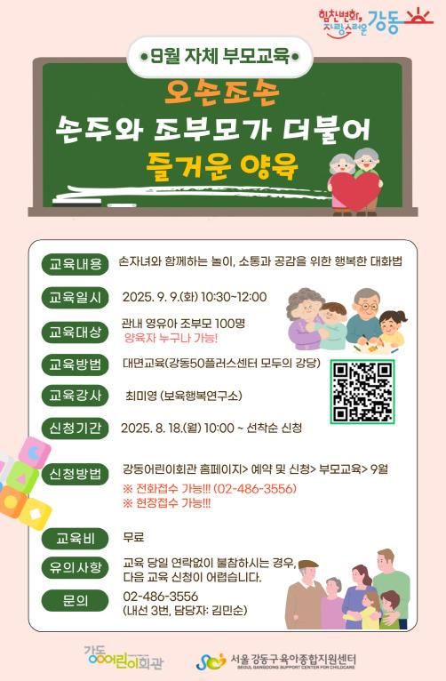두 교육 모두 90분 동안 진행되며, 강동구 내 미취학 영유아를 양육하는 조부모와 부모라면 누구나 무료로 참여할 수 있다. 신청은 강동어린이회관 누리집(홈페이지)에서 가능하다.