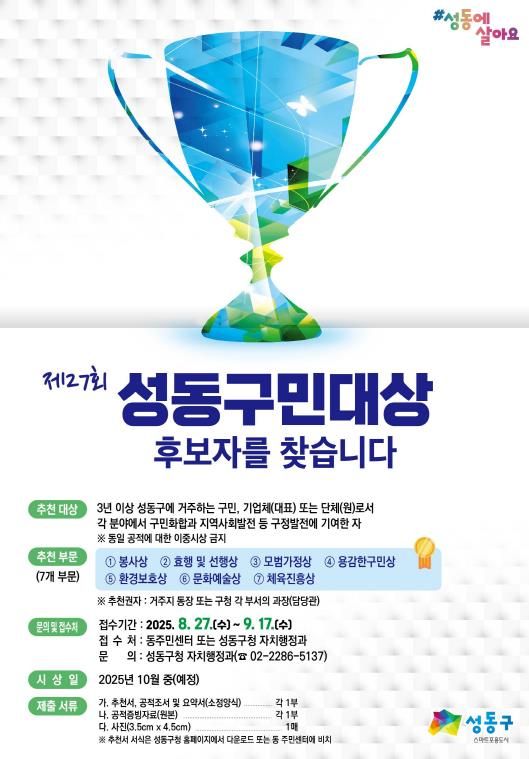 한방통신사 신유철기자 기자 | 서울 성동구는 오는 9월 17일까지 지역사회 발전과 밝고 건전한 사회 기풍 조성에 크게 기여한 구민 및 단체를 대상으로 '제27회 성동구민대상' 후보자를 추천받는다고 밝혔다.
