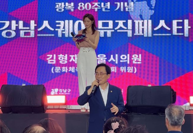 한방통신사 신유철기자 기자 | 서울특별시의회 김형재 의원(국민의힘, 강남2)은 8월 29일 강남스퀘어에서 열린 광복 80주년 기념 강남뮤직페스타에 참석해 축사를 전했다.