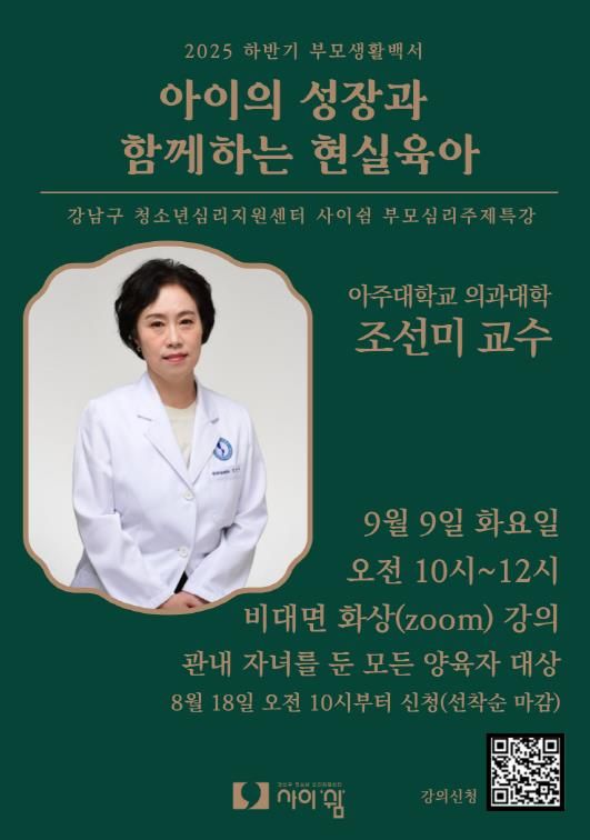 강연은 아주대학교 의과대학 조선미 교수(임상심리전문가)가 맡는다. 조 교수는 30여 년간 아이와 부모를 대상으로 심리 평가와 상담, 부모 교육을 이어온 국내 최고 수준의 전문가로, 현실육아 분야에서 영향력 있는 멘토로 꼽힌다. 그는 아이가 성장하며 겪는 발달 단계별 변화를 어떻게 현명하게 받아들이고 대처해야 하는지, 부모들이 가장 궁금해하는 실제적인 양육 지침을 제시할 예정이다.