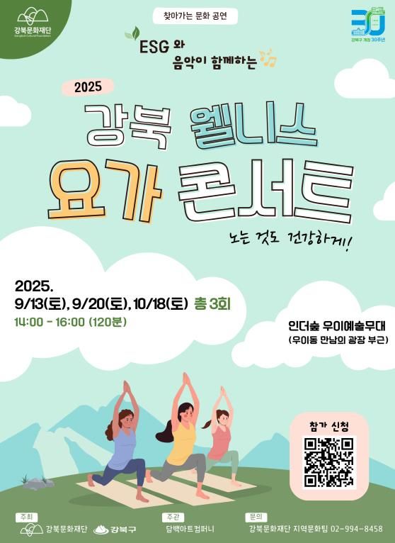한방통신사 신유철기자 기자 | 서울 강북문화재단은 오는 9월 13일, 20일, 10월 18일 우이동 인더숲 우이예술무대에서 ESG와 음악이 함께하는 ’강북 웰니스 요가 콘서트‘를 개최한다.
