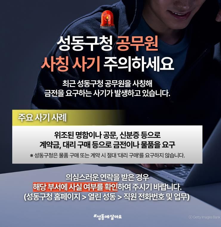 한방통신사 신유철기자 기자 | 최근 전국적으로 공공기관을 사칭한 피싱 범죄가 급증하는 가운데, 성동구는 공무원을 사칭한 범죄가 발생함에 따라 추가 피해 방지를 위해 각별한 주의가 필요하다고 밝혔다.