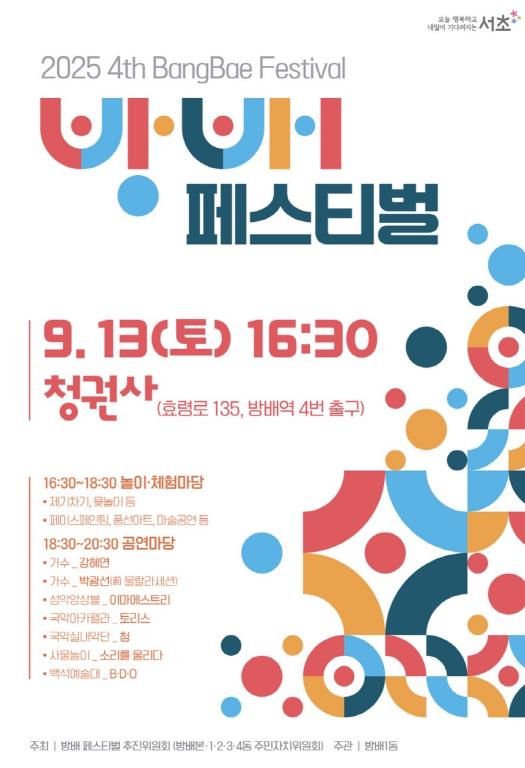 방배권역 문화축제 ‘방배 페스티벌’은 13일 청권사에서 방배 지역 5개 동이 모여 열린다. 제기차기, 윷놀이 등 전통놀이와 전통 차 마시기, 한복 예절 배우기, 꽃절편 만들기 등 최근 세계적인 인기인 K-문화를 체험할 수 있는 것이 특징이다. 여기에 성악, 국악, 대중음악 모두를 즐길 수 있는 공연도 이어진다.