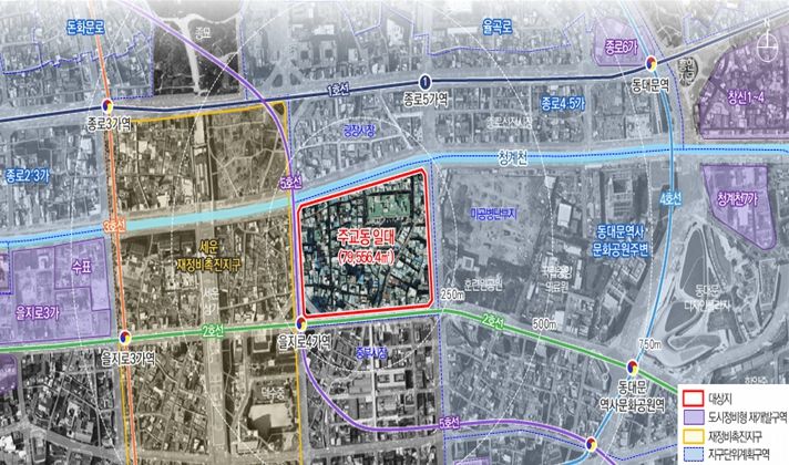 그에 비해, 해당 구역은 광장시장, 청계천 등 다양한 관광자원과 인접해 있고, 서측의 세운재정비촉진지구 사업 활성화 등 지역 여건이 변화하고 있어, 주교동의 성장 잠재력 또한, 높은 것으로 판단된다.