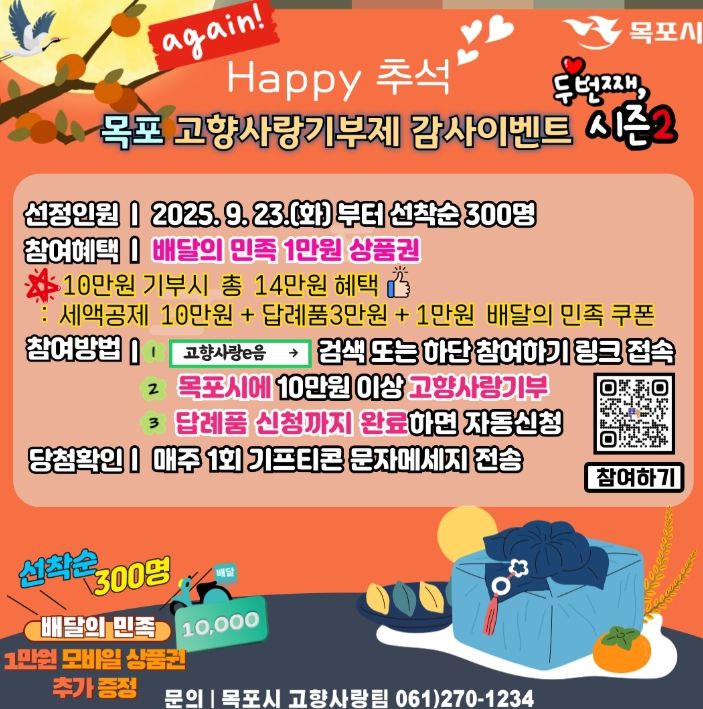한방통신사 신다은기자 기자 | 목포시는 지난 16일부터 진행한 추석 명절맞이 고향사랑기부제 참여 이벤트가 기부자들의 뜨거운 성원에 힘입어 단 3일 만에 조기 종료됨에 따라, 후속 행사인 ‘Happy 추석~ 목포 고향사랑기부제 감사이벤트 시즌2’를 추진한다고 밝혔다.