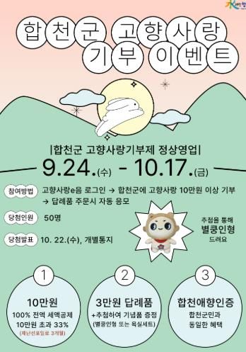 한편, 고향사랑기부제는 개인이 주소지 외의 지방자치단체에 연간 2,000만원 이하의 금액을 기부하면 세액공제와 함께 최대 30%의 답례품(지역특산물 및 합천사랑상품권)을 받는 제도다.