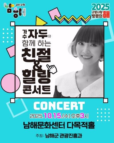 한방통신사 신유철기자 기자 | 남해군은 오는 10월 15일 오후 3시, 남해문화센터 다목적홀에서 ‘가수 자두와 함께하는 친절 & 힐링 콘서트’를 개최한다.